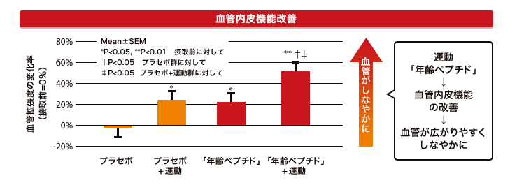 運動だけするのと、年齢ペプチドだけを飲むのでは、同じぐらい血管がしなやかになっています。